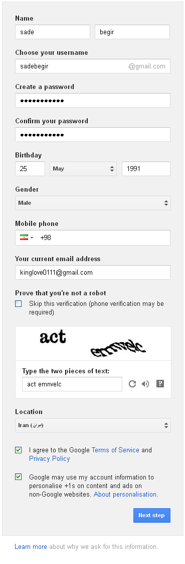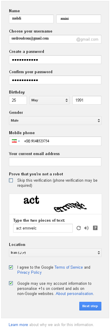 - در فیلد Your current email address یک پست الکترونیک (جمیل) معتبر وارد کنید. نکته : اگر نمیخواهید شماره تلفن وارد کنید حتما باید در فیلد زیر یک جیمیل معتبر وارد کنید