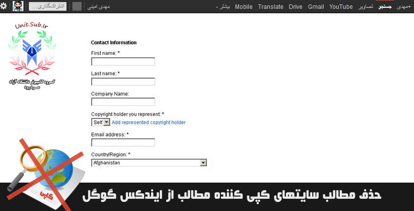 در بخش Contact Information اطلاعات تماس خود را میدهید. در فیلد First name نام خود، در فیلد Last name نام خانوادگی خود، در فیلد Company Name نام شرکت خود، در فیلد Copyright holder you reresent مشخص میکنید که قانون کپی رایت بر سایت شما رعایت نشده یا سایت شخص دیگر، در فیلد Email address ایمیل آدرس خود را وارد میکنید و در فیلد Country/Region کشور مورد خود را انتخاب کنید.