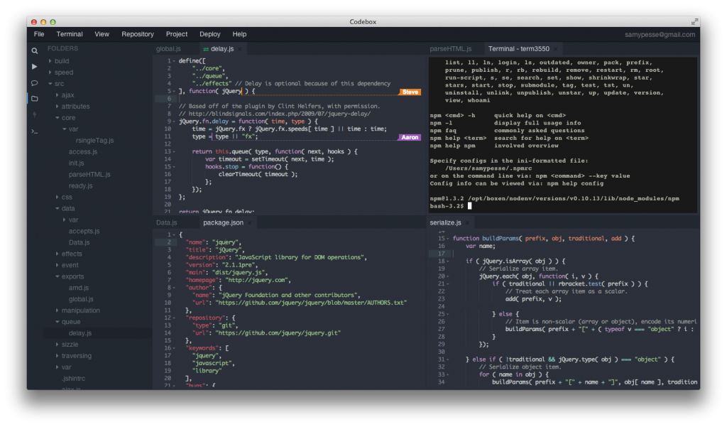 codebox در واقع یک پلتفرم Cloud است اما برخلاف پلتفرم های دیگر IDE آن کاملا رایگان و Open Source است. از مهمترین ویژگی های Codebox محیط ادیتور پیشرفته آن است که واقعا احساس میکنید که درون Sublime Text در حال نوشتن کد هستید. Auto Complete آن بسیار پیشرفته است، همچنین برای پروژه های تیمی نیز بسیار مناسب است. همچنین با git نیز بسیار خوب کار میکند و دارای ترمینال و محیط دیباگ نیز است. تمام این ویژگی های بسیار خوب با نوشتن این برنامه با Nodejs قابل پیاده سازی شده است.
